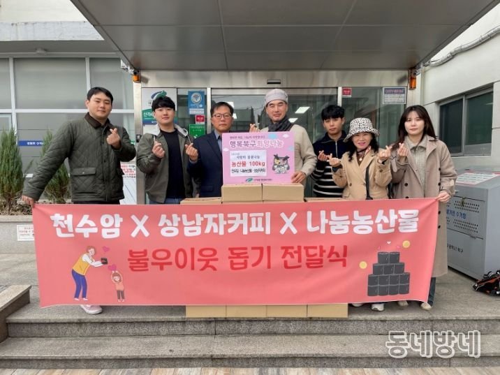 동네방네 김형규 기자 | 대구 북구 산격4동 소재 상남자커피(대표 서준호)가 천수암(주지 혜천), 나눔농산물(대표 서욱)과 함께 3월 25일 산격4동 행정복지센터(동장 정종표)를 방문하여 관내 저소득층에 전달해달라며 농산물 100kg을 후원했다.