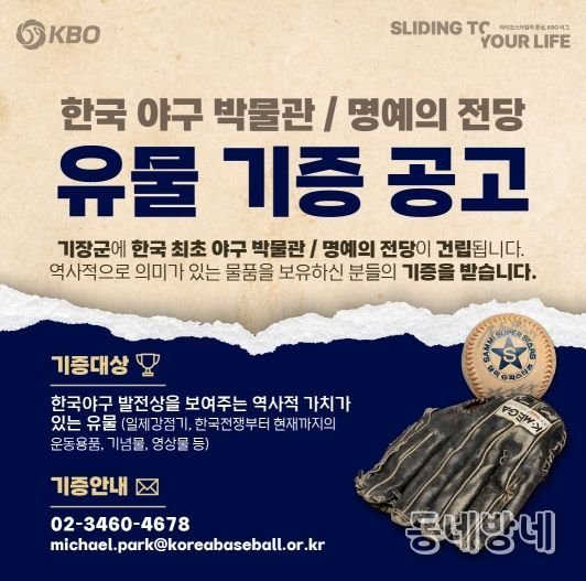 동네방네 김형규 기자 | KBO(총재 허구연)가 역사적으로 의미가 있는 야구물품에 대한 기증을 받는다.