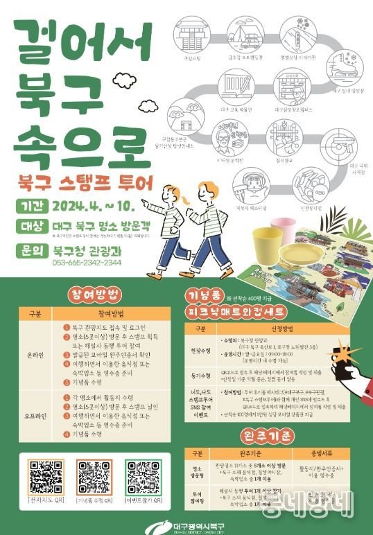 동네방네 김형규 기자 | 대구 북구청은 오는 4월 15일부터 10월까지 북구 곳곳을 여행하며 지역의 역사와 문화를 체험함과 동시에 여행의 재미를 더할 수 있는 ‘걸어서 북구 속으로!’ 관광명소 스탬프 투어를 운영한다.
