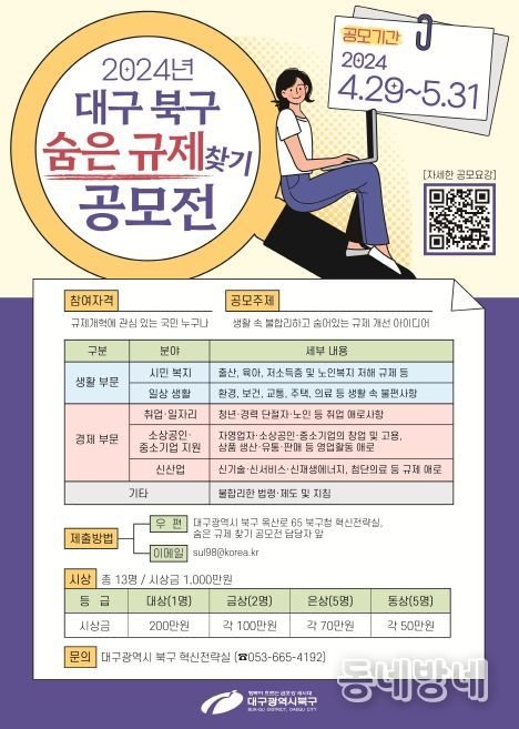 동네방네 김형규 기자 | 대구 북구청은 일상생활에 불편을 주고, 기업 및 소상공인의 경제활동을 저해하는 불합리한 규제를 개선하기 위해 전국민을 대상으로‘2024년 대구 북구 숨은 규제 찾기 공모전’을 개최한다.