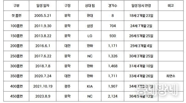 한 팀에서만 활약하며 매년 꾸준함으로 대기록 달성을 앞둔 최정은 지금과 같은 활약을 이어간다면 KBO리그 최초 개인 통산 500홈런 달성도 시간 문제일 것으로 전망된다.