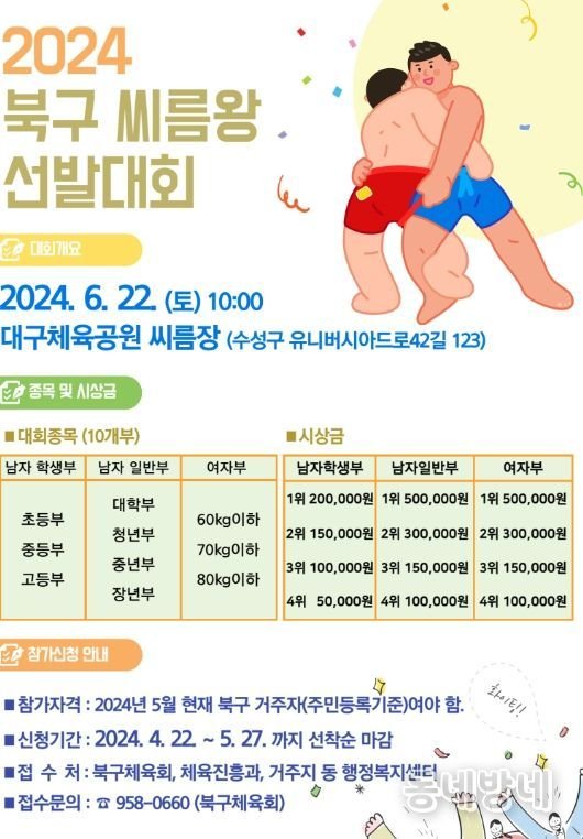 동네방네 김형규 기자 | 2024년 대구 북구 씨름왕 선발대회가 6월 22일 대구체육공원 씨름장(대구스타디움 암벽등반장 앞)에서 개최되며, 참가선수 신청은 4월 22일부터 5월 27일까지 접수한다.
