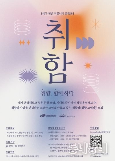 동네방네 김형규 기자 | 대구 북구청은 청년들이 주체로서 지속 가능한 커뮤니티를 형성할 수 있는 ‘취향과 사람, 사람과 취향을 잇는’ 플랫폼형 사업 ‘취함 : 취향 함께하다’를 추진한다.