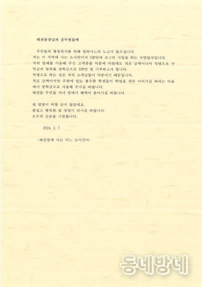 2월 7일 태전1동 행정복지센터에 중년의 남성이 찾아와 현금과 편지가 담긴 봉투를 건넨 후 돌아갔다.