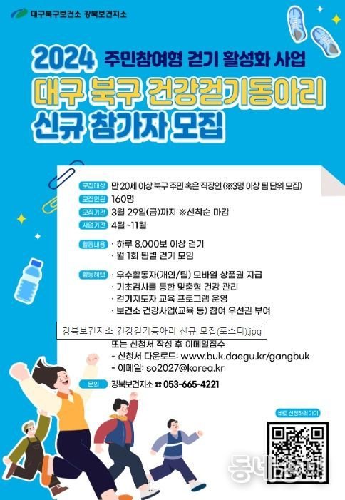 동네방네 김형규 기자 | 대구 북구보건소는 관내 걷기 실천 분위기를 확산을 위해 2월 15일부터 3월 29일까지 건강걷기동아리 신규 참여자를 모집한다.