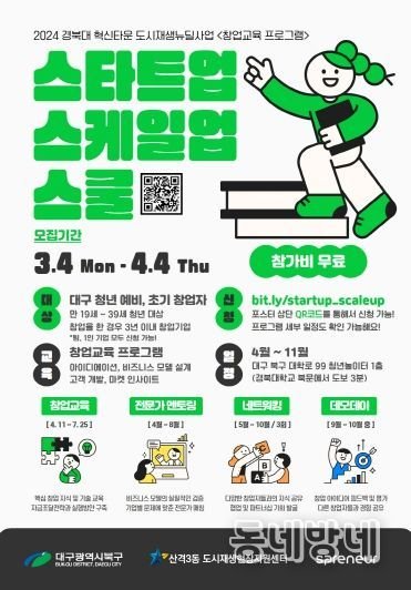이영희 산격3동 도시재생현장지원센터장은 “스타트업 스케일업 스쿨은 성과가 우수했던 작년 드림업 스쿨의 확장 프로그램으로 청년 창업가들이 창업 역량을 키우고 지역에서 성장할 수 있도록 최선을 다해 운영하겠다”라고 밝혔다.