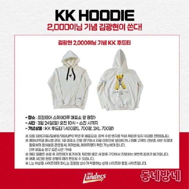 동네방네 기자 | SSG랜더스(대표이사 민경삼, 이하 SSG)는 24일(일) 인천SSG랜더스필드에서 열리는 롯데 자이언츠와의 홈경기에서 ‘KK 2,000 Hoodie’ 이벤트를 실시한다.